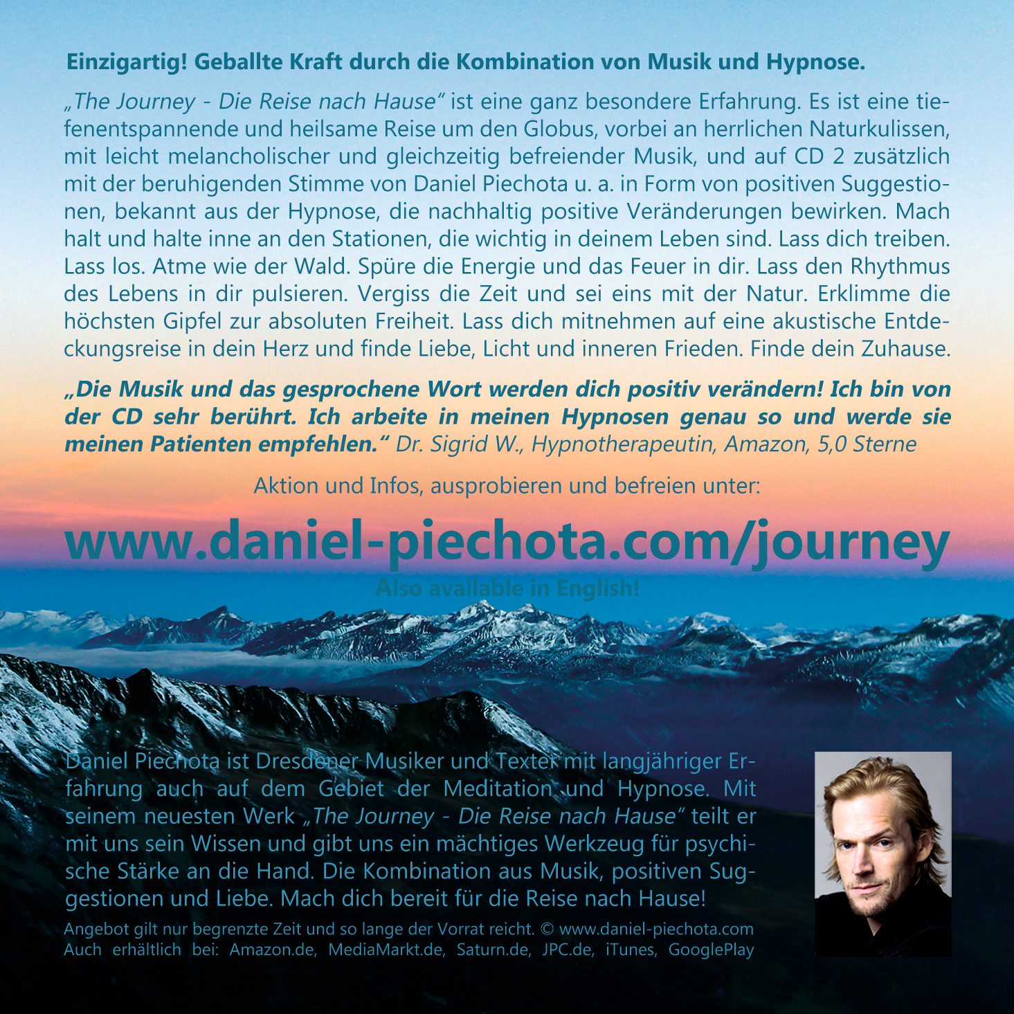 "The Journey - Die Reise nach Hause" ist eine tiefenentspannende und heilsame Reise um den Globus, vorbei an herrlichen Naturkulissen, mit leicht melancholischer und gleichzeitig befreiender Musik, und auf CD 2 zusätzlich mit der beruhigenden Stimme von Daniel Piechota in Form von positiven Suggestionen. Mach halt und halte inne an den Stationen, die wichtig in deinem Leben sind. Lass dich treiben. Lass los. Atme wie der Wald. Spüre die Energie und das Feuer in dir. Lass den Rhythmus des Lebens in dir pulsieren. Vergiss die Zeit und sei eins mit der Natur. Erklimme die höhsten Gipfel zur absoluten Freiheit. Lass dich mitnehmen auf eine akustische Entdeckungsreise in dein Herz und finde Liebe, Licht und inneren Frieden. Finde dein Zuhause.